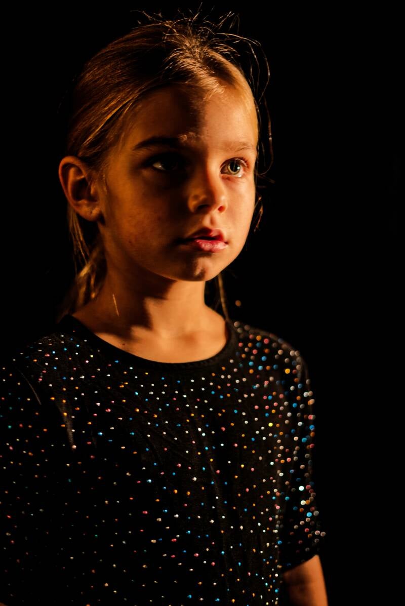 Girl, intense look, black background